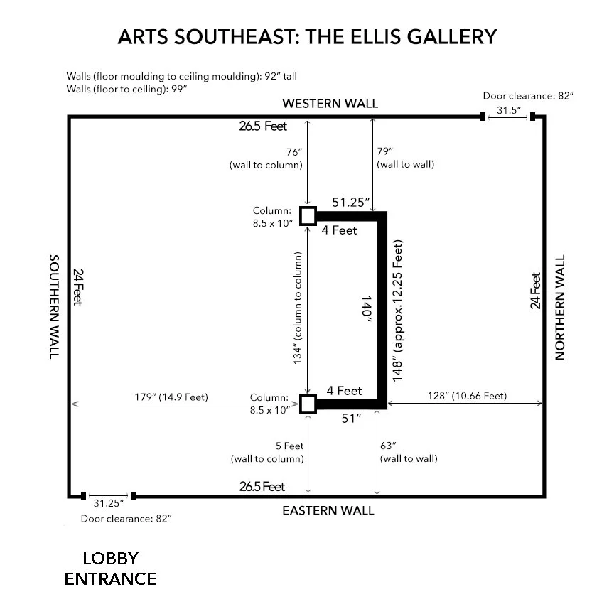 The Ellis Gallery at ARTS Southeast is a 720sq ft. white box space with a center feature wall (the alcove) and 142ft of running wall space.
