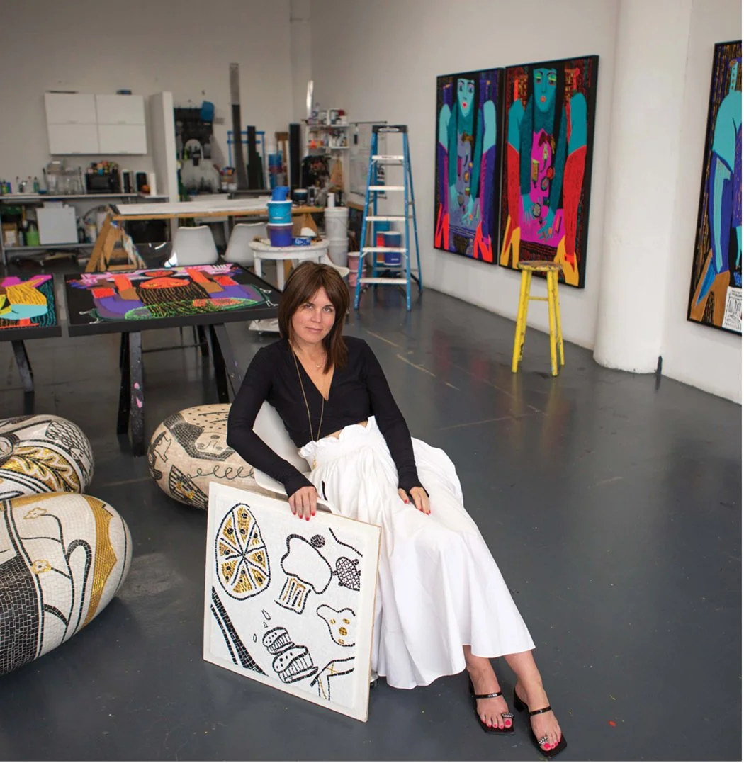 I had heard of her utterly unique process for making paintings – how she uses pastry bags, extruders and squeegees to push an alchemical paint mixture through wire mesh, which, after drying, resembles a tapestry more than a painting. As a former pastry chef turned curator and art-cookie hobbyist, I was especially thrilled to see this process up close. Her studio was a feast for the eyes: expansive paintings, maquette models for dreamed-up projects, sparkling mosaic-tiled sculptures, prototypes for precious jewelry pieces. Wheat experiments with materials, transforming paint into something unexpected. The finished work retains both the impulses of intuition and the sharpness of editorial restraint. What struck me most, though, was the lingering sense of familiarity. Her artwork makes something distant — some memory or story from far away or long ago — feel tactile and present. Her work conjures a closeness that is physical and emotional. The textures are heightened. The forms are legible. It taps into something primal — the instinct to remember, to feel, to connect across time through material.