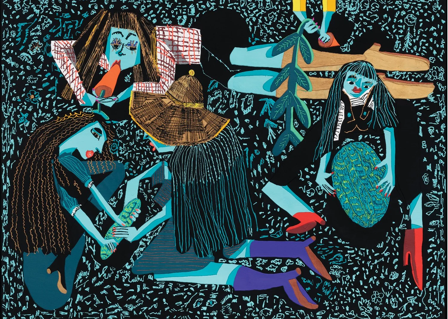 SW: Space for me isn’t empty — it’s charged. Nets and grids are both protective and restrictive; they can hold you, but they can also trap you. In Fruits of Labor, the figures live inside this latticework of connections, which feels a lot like life — we’re bound to each other in ways that can nourish or constrain. My interest in space extends beyond paintings into architectural works like Foragers and Jewel House because I want viewers to feel inside the work, not just in front of it. A painting can be a room, and a room can be a painting.