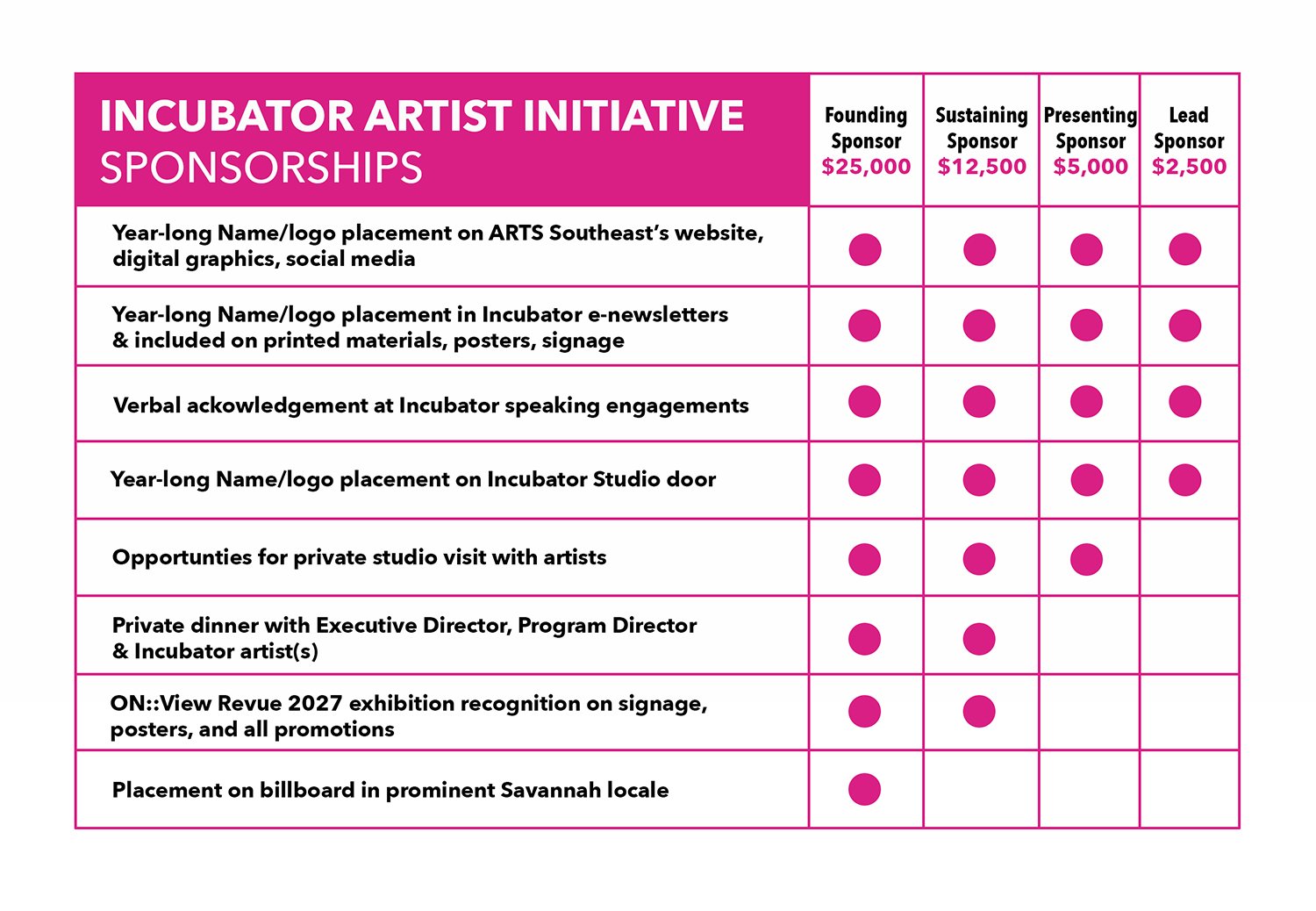 ARTS Southeast is seeking sponsors to support the Incubator Artist Initiative, a longterm residency that nurtures emerging local talent, and provides deep support that isn’t offered anywhere else in Savannah. Providing this dedicated time and space to early career artists creates a launch pad for artistic inquiry and community connection. As a sponsor, you’ll play a direct role in helping to cultivate the next generation of Southern artists.