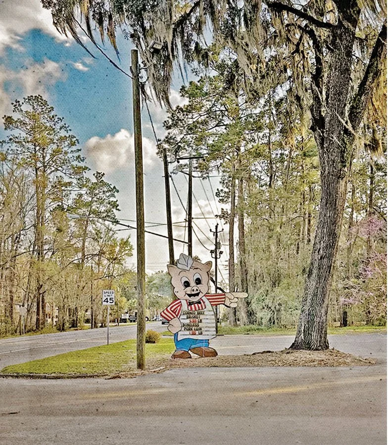 Greetings from Georgia where the air is wet n’ wooly and there’s nothing for it but to set the controls for the heart of the swamp. Thirty minutes earlier we had departed from Savannah. It’s the last weekend in July, and we’re rollin’ and tumblin’ down Highway 17. We came down here with an idea: to locate and write about unintentional local monuments. There’s the forty-foot-tall red boot above Callie Kay’s Workwear in Waycross; the fat plaster cow in front of Keller’s Flea Market in Georgetown; the grinning plastic mascot, overdue for a power-washing, outside the Piggly Wiggly in Eulonia.