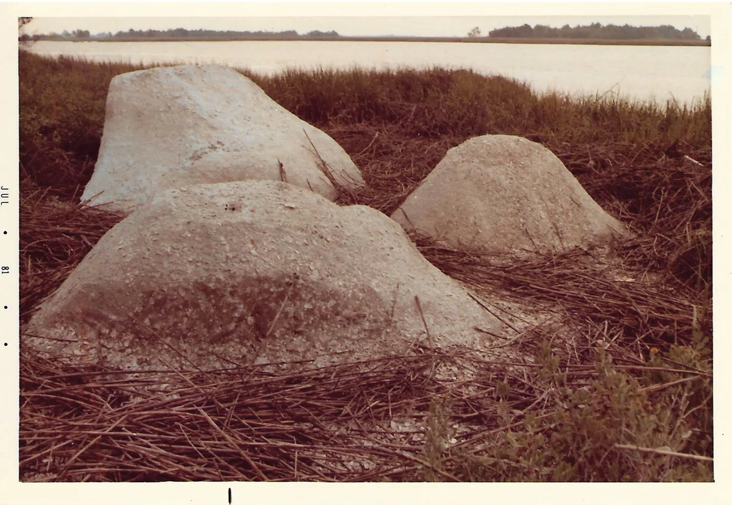 highway (that may be invisible). We planned for low tide and searched through a municipal parklet wedged between Highway 17 and the spectacular Marshes of Glynn. Marsh Ruins (1981) is wedged into a liminal space cornered near a fishing pier. Three mound-like, hand-made “rocks”, once having reached over four feet in height out of the water, are now sunken, splitting, disintegrating tabby mounds. These erratic forms appear glacial as if they tumbled too far south. They look like fake dinosaur eggs, their shells compromised by millennia, that you might see in a natural history museum. These are not the neat cubes of Minimalism. They are unassuming as if complicating the mythic largess of earthworks.
