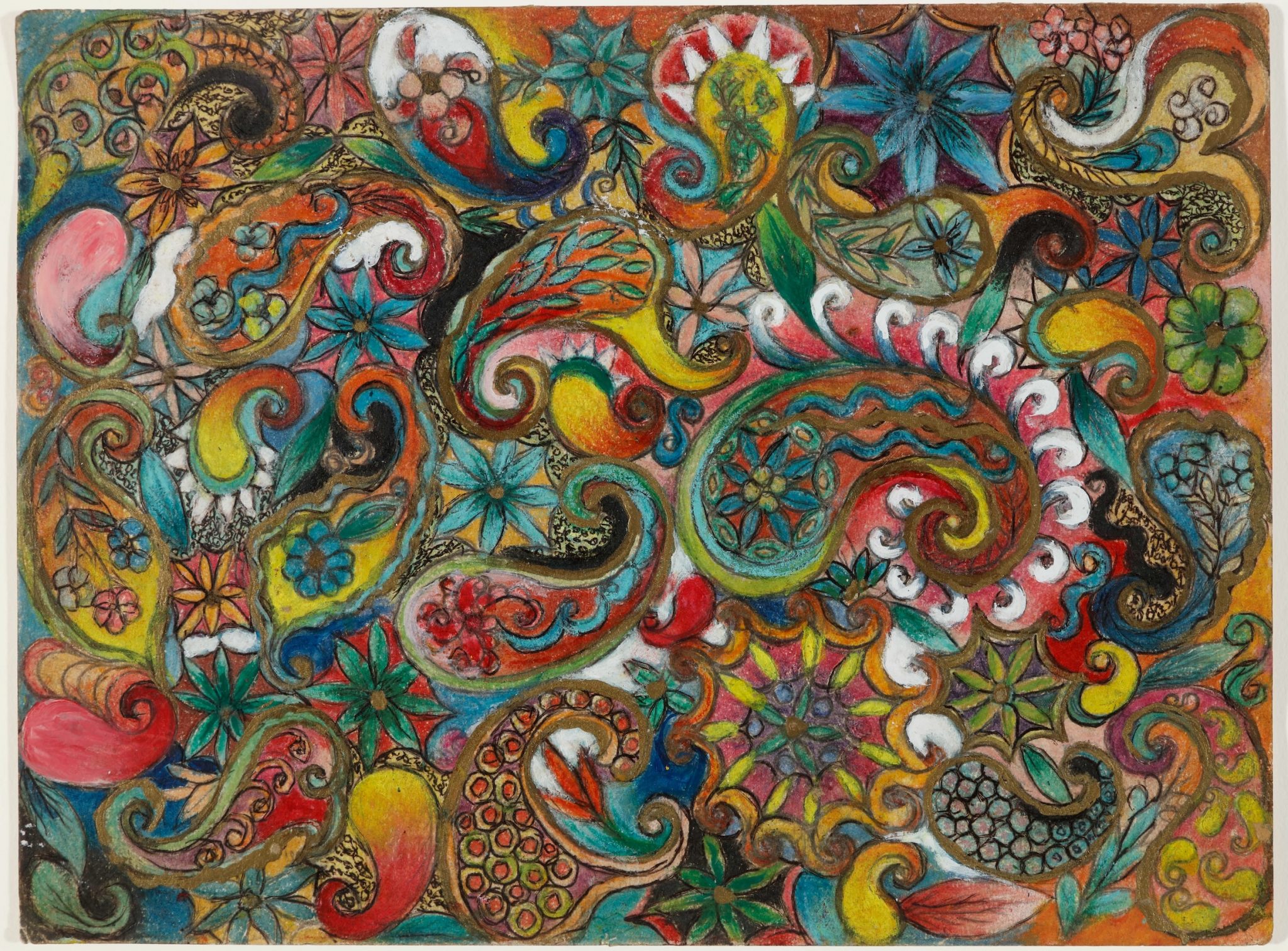 Minnie Evans (1892 – 1987) said her drawings of harmoniously intertwined human, botanical, and animal forms came from visions of “the lost world” or nations destroyed by the Great Flood described in the Book of Genesis. After her grandmother Mary died in 1934 and the visions she had been experiencing since childhood became stronger, Evans produced a large body of work, mostly on paper, in a range of abstract and representational styles. Primarily using wax crayons and pencil, Evans experimented with compositions whose complex symmetry resonates with the tradition of Hindu and Buddhist mandalas, known for offering representations of the interconnectedness of the universe. This association was never articulated by Evans, but it has become one of the most enduring of the many cross-cultural and transhistorical comparisons drawn by her art.