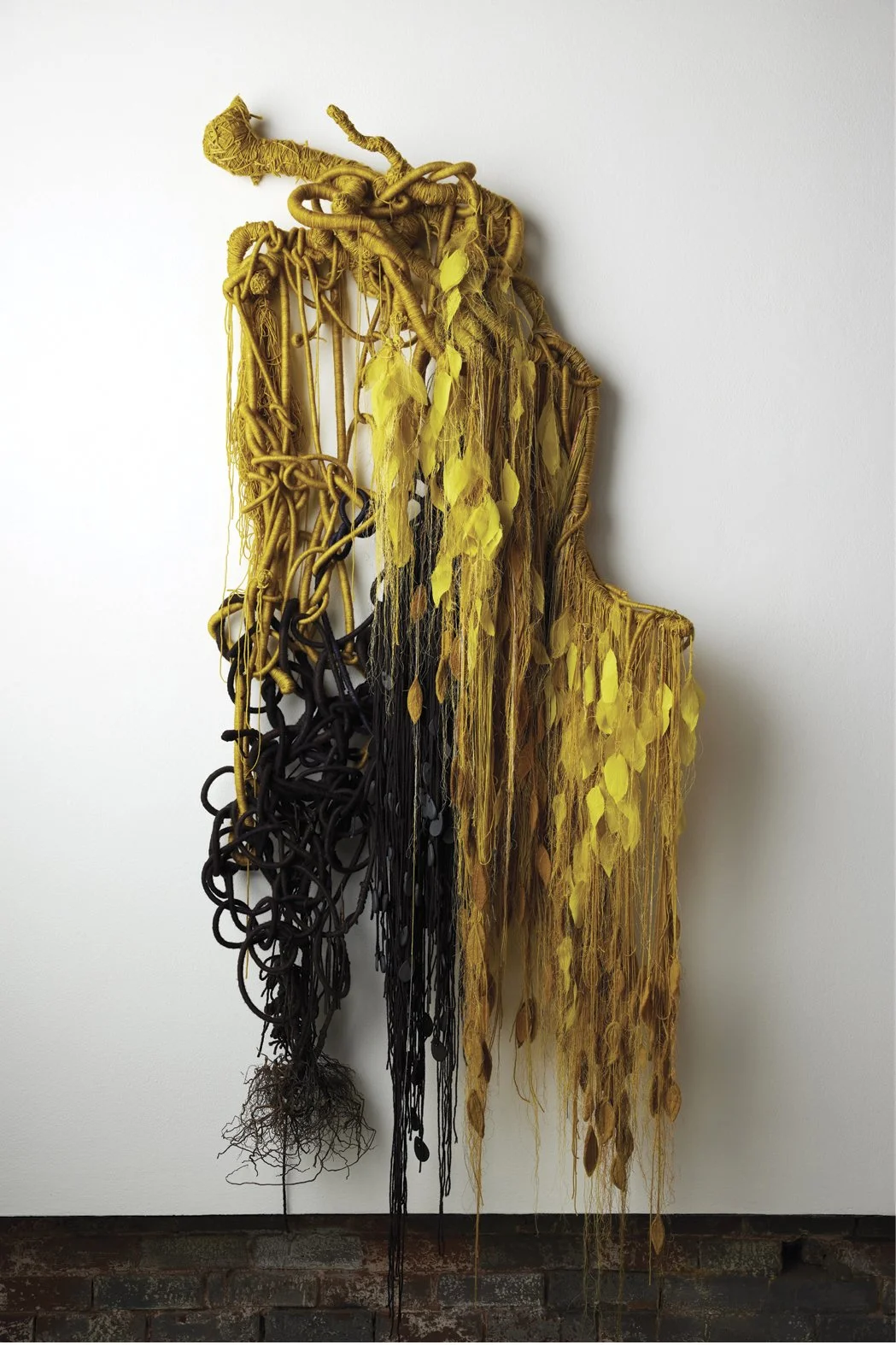 Sonya Yong James, All the yellow leaves (with S) (October) (Bethany), 2023. All hand dyed wool felt, wool yarn, silk habotai, silk organza, natural black clay, branch, silk thread, cotton thread, wood stain and root ball, 80 x 35 x 10 inches.